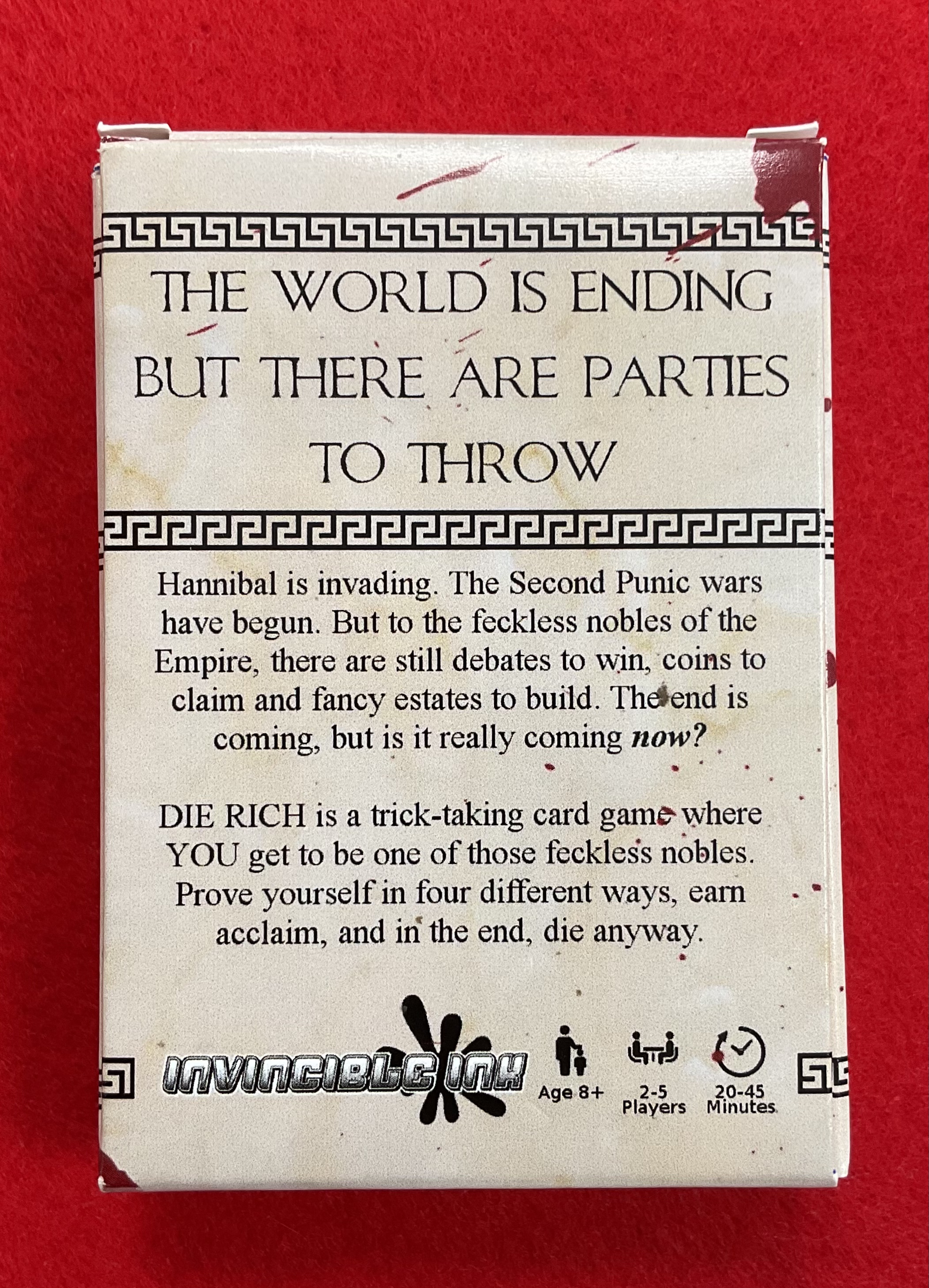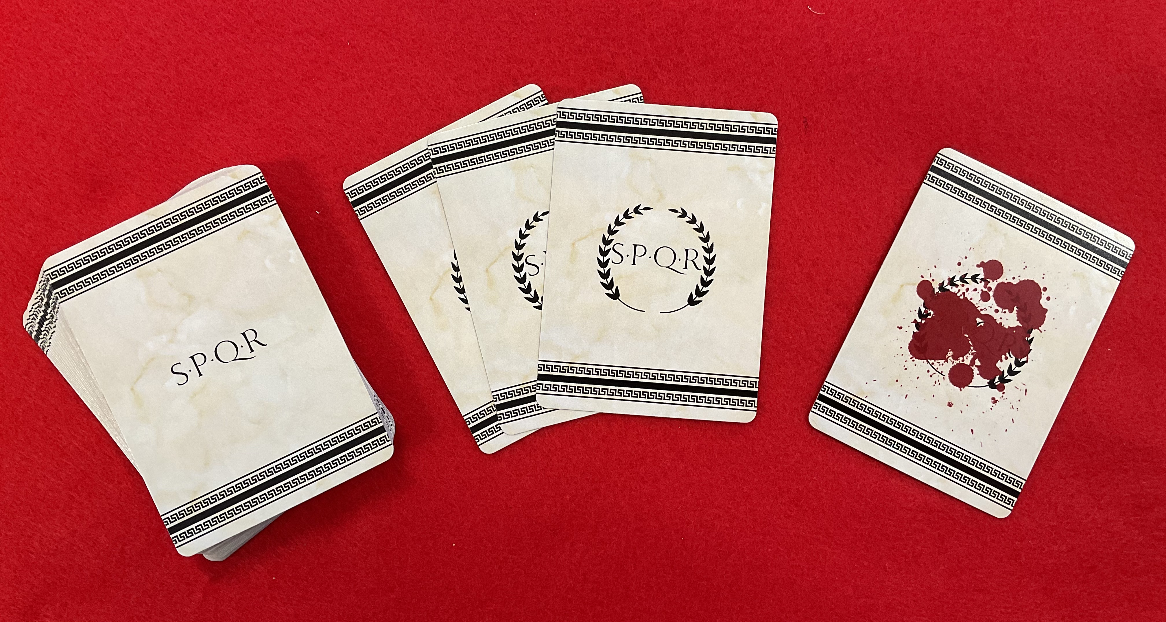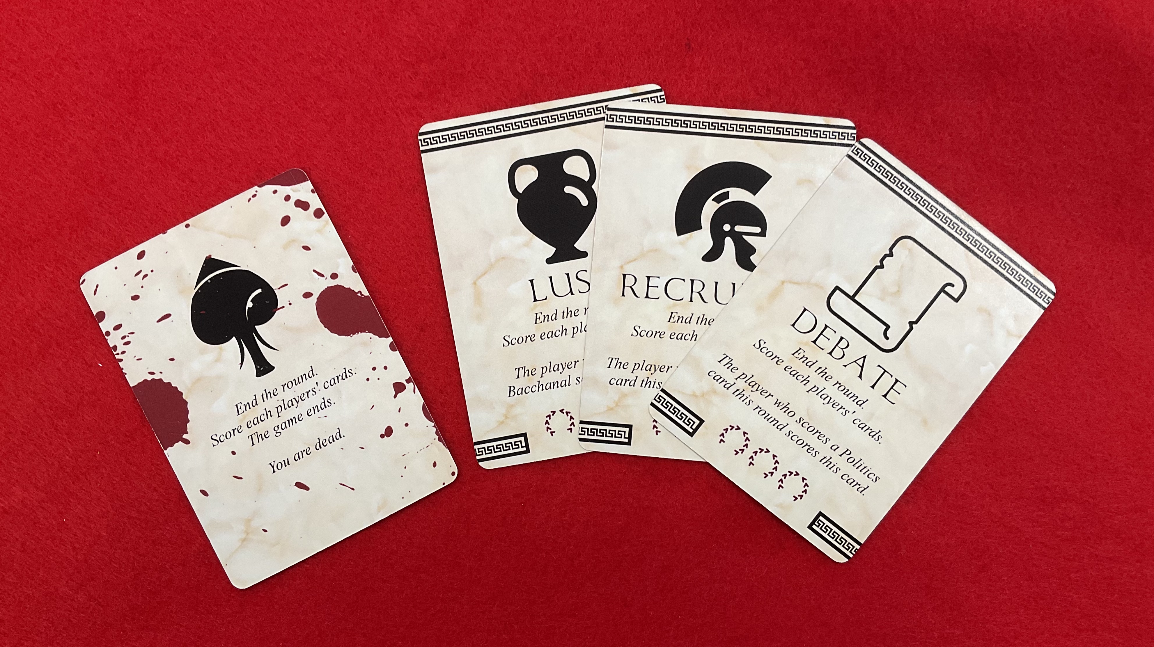 The cards have one of four Roman themes to them, allowing for competitive play and strategic choice. Bacchanalia, Politics, Property, and Market.